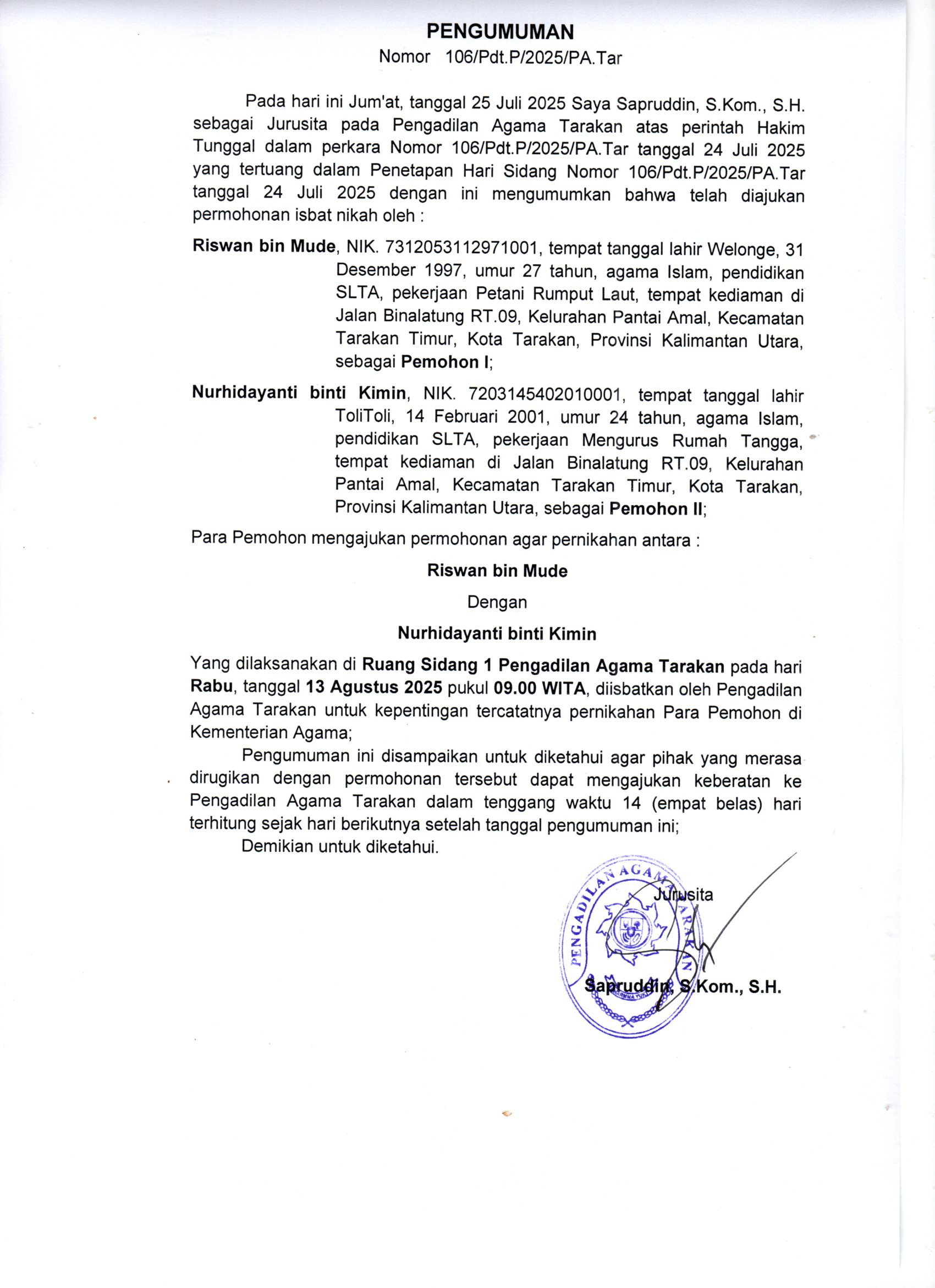 Next article: Pengumuman Perkara Nomor 434/Pdt.G/2025/PA.Tar