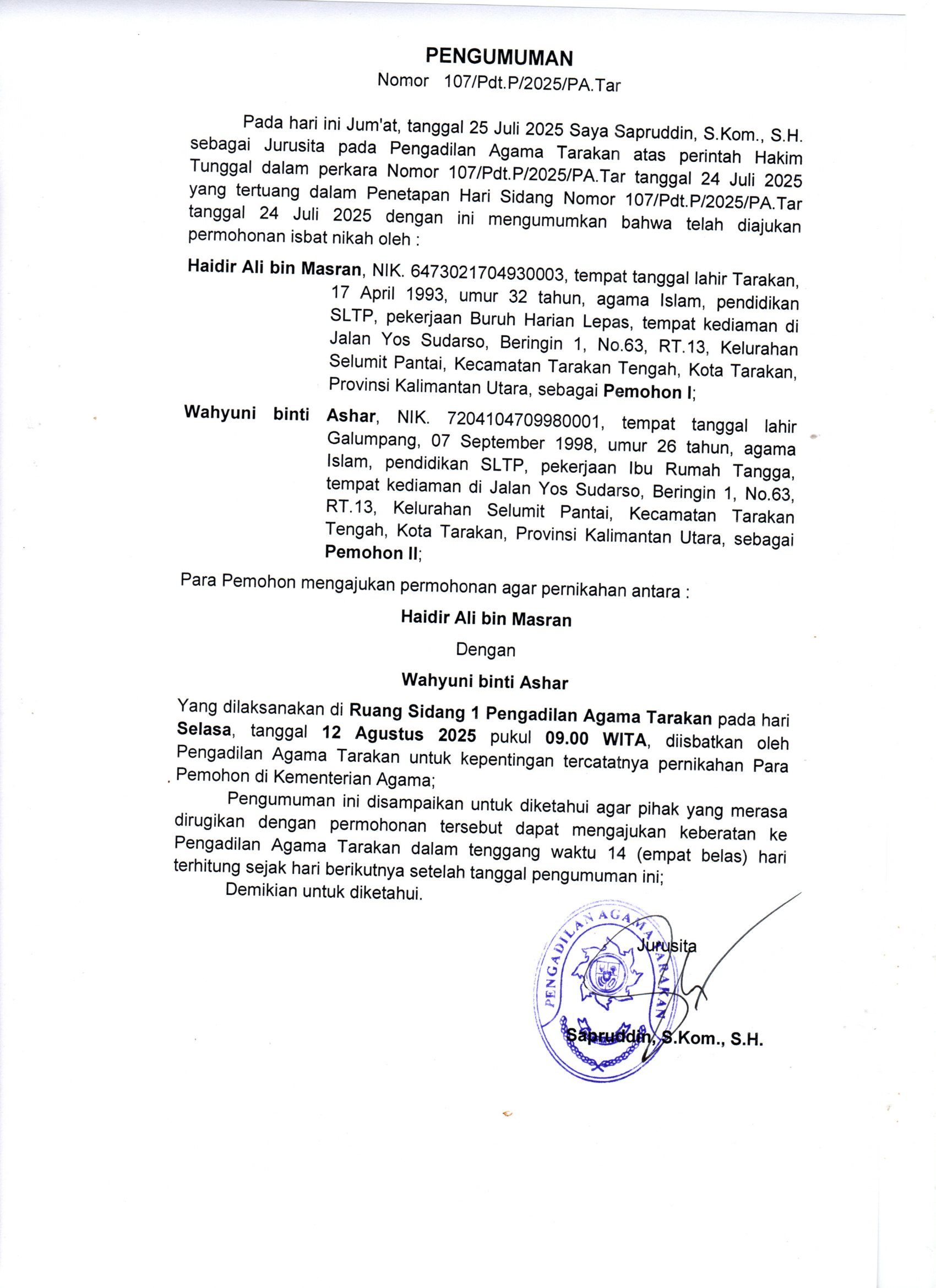 Next article: Pengumuman Perkara Nomor 106/Pdt.P/2025/PA.Tar