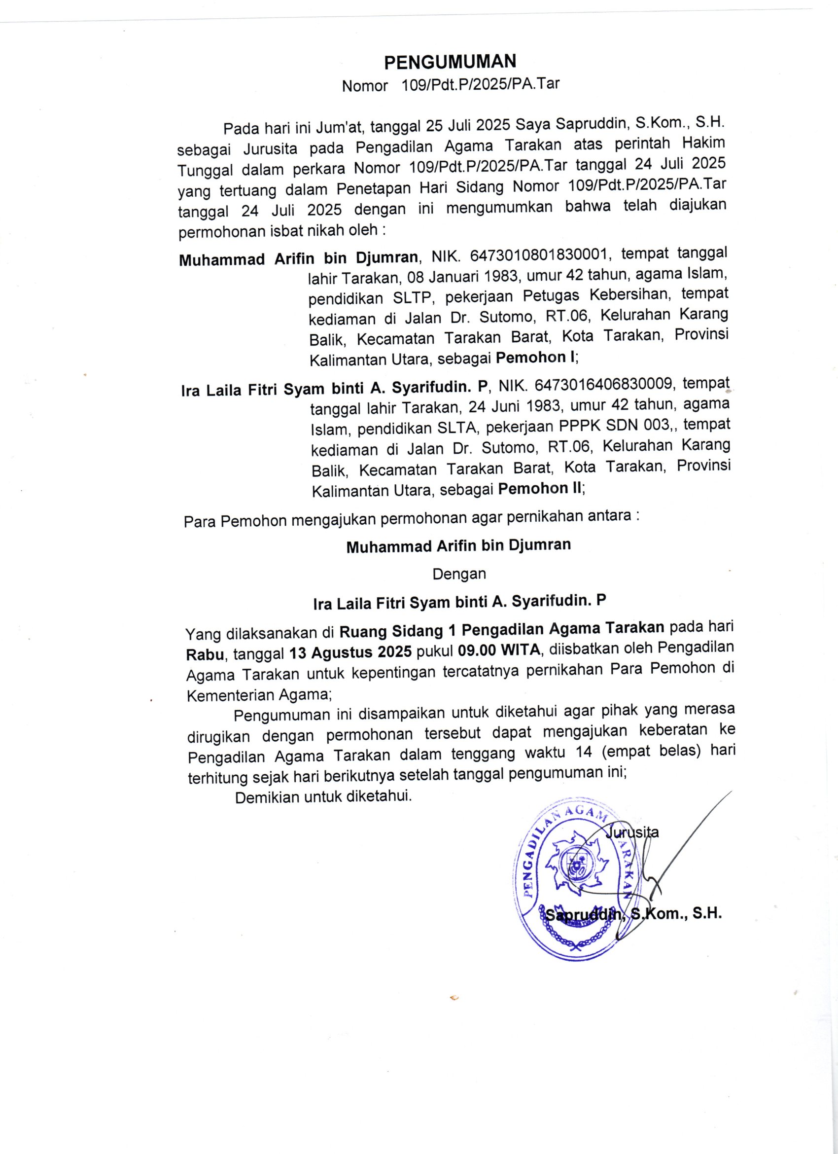 Next article: Pengumuman Perkara Nomor 107/Pdt.P/2025/PA.Tar