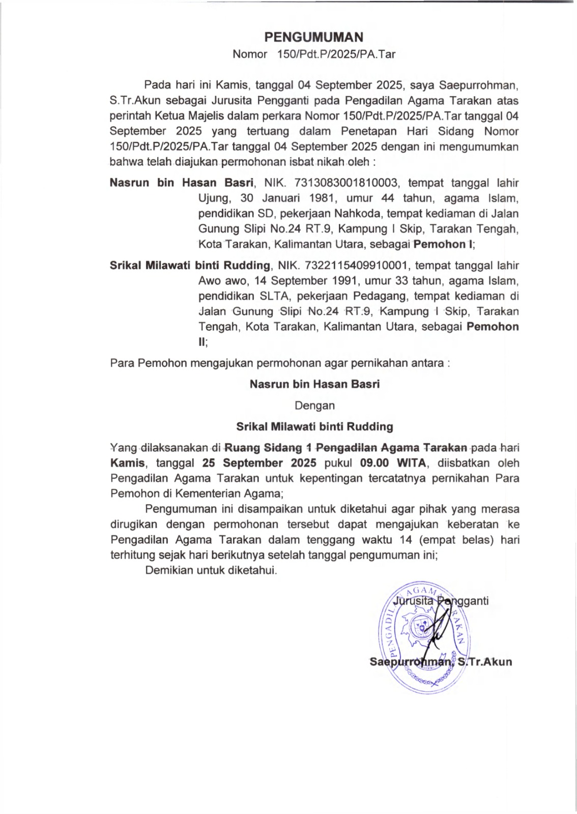 Sidang Keliling Pengadilan Militer I-07 Balikpapan di PA Tarakan