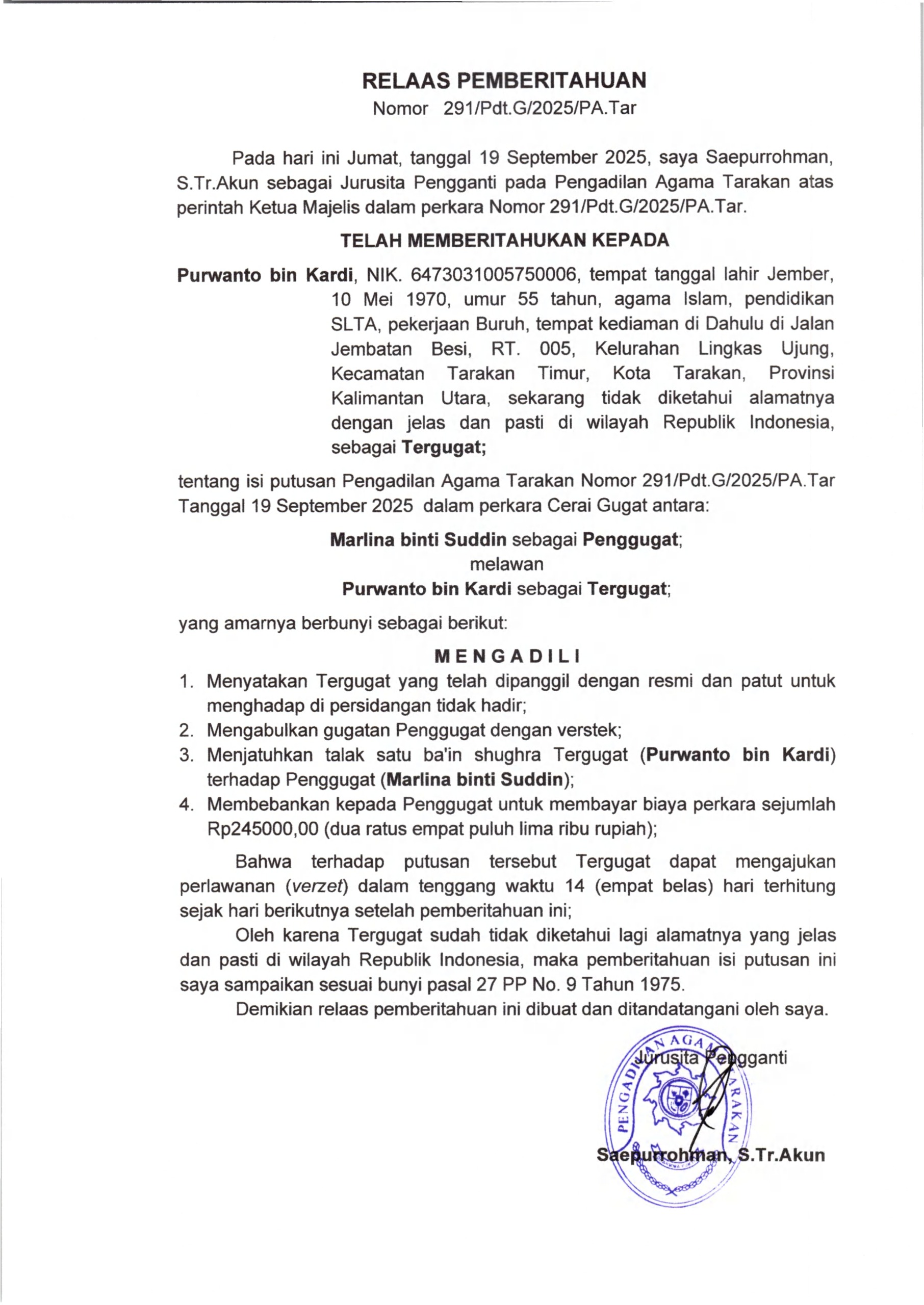 Panitera PA Tarakan Menghadiri Undangan Pelaksanaan Constatering dari Panitera PN Tarakan
