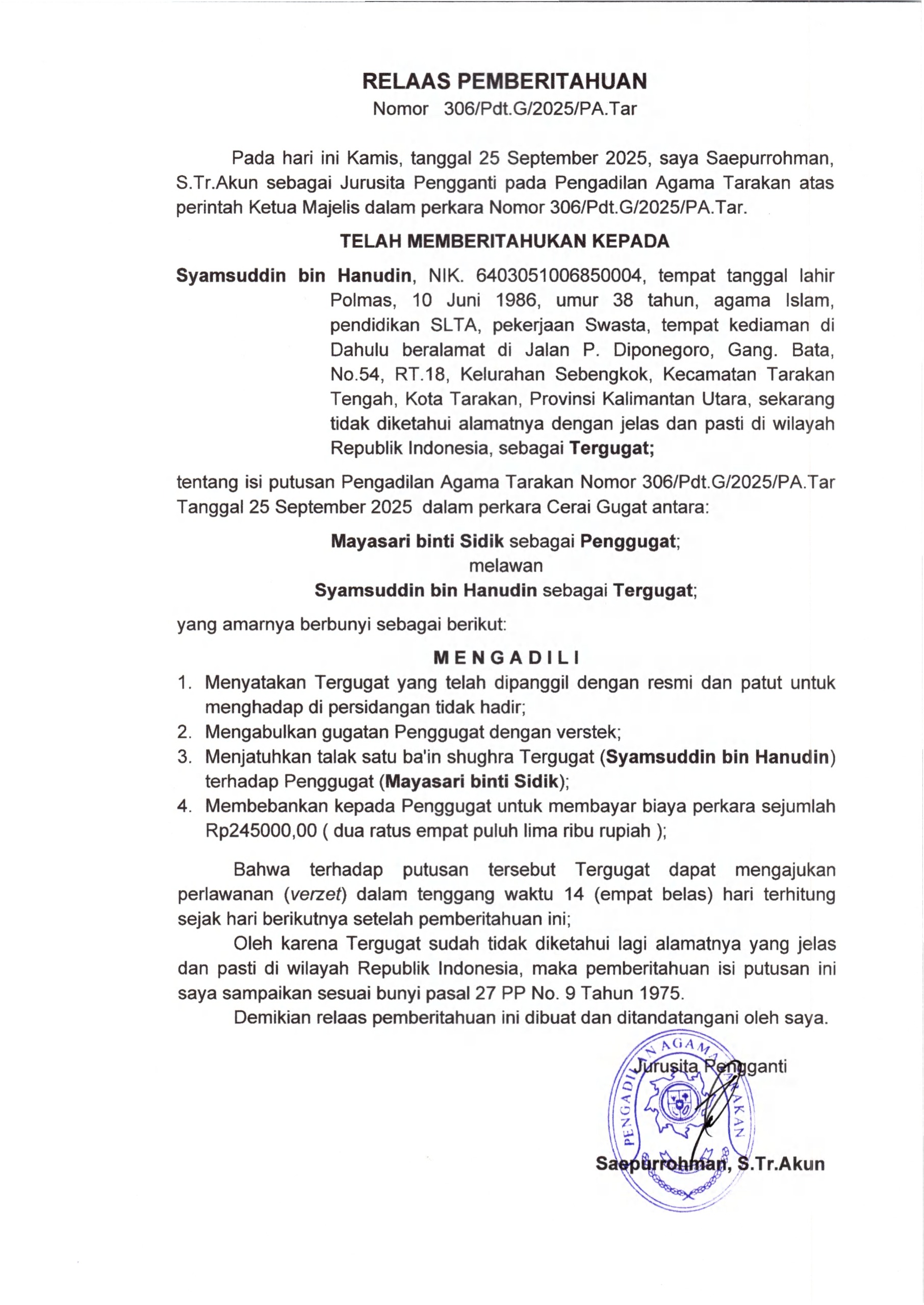 Panitera PA Tarakan Menghadiri Undangan Pelaksanaan Constatering dari Panitera PN Tarakan