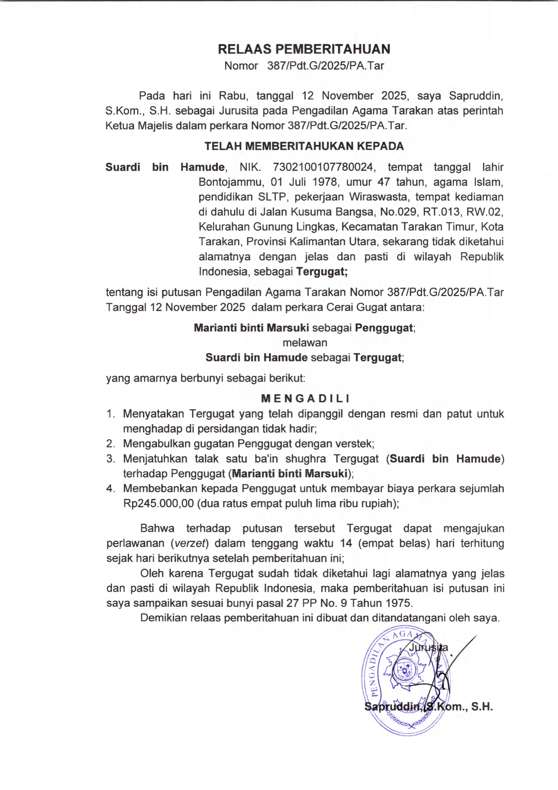 Dalam memberikan pelayanan, Pengadilan Agama Tarakan tidak menerima pemberian dalam bentuk apapun, baik kepada perorangan maupun lembaga. Apabila terdapat penyimpangan pada saat menerima layanan kami, agar melaporkan melalui Sistem Informasi Pengawasan (SIWAS) Badan Pengawasan Mahkamah Agung Republik Indonesia dengan mengakses link: https://siwas.mahkamahagung.go.id.