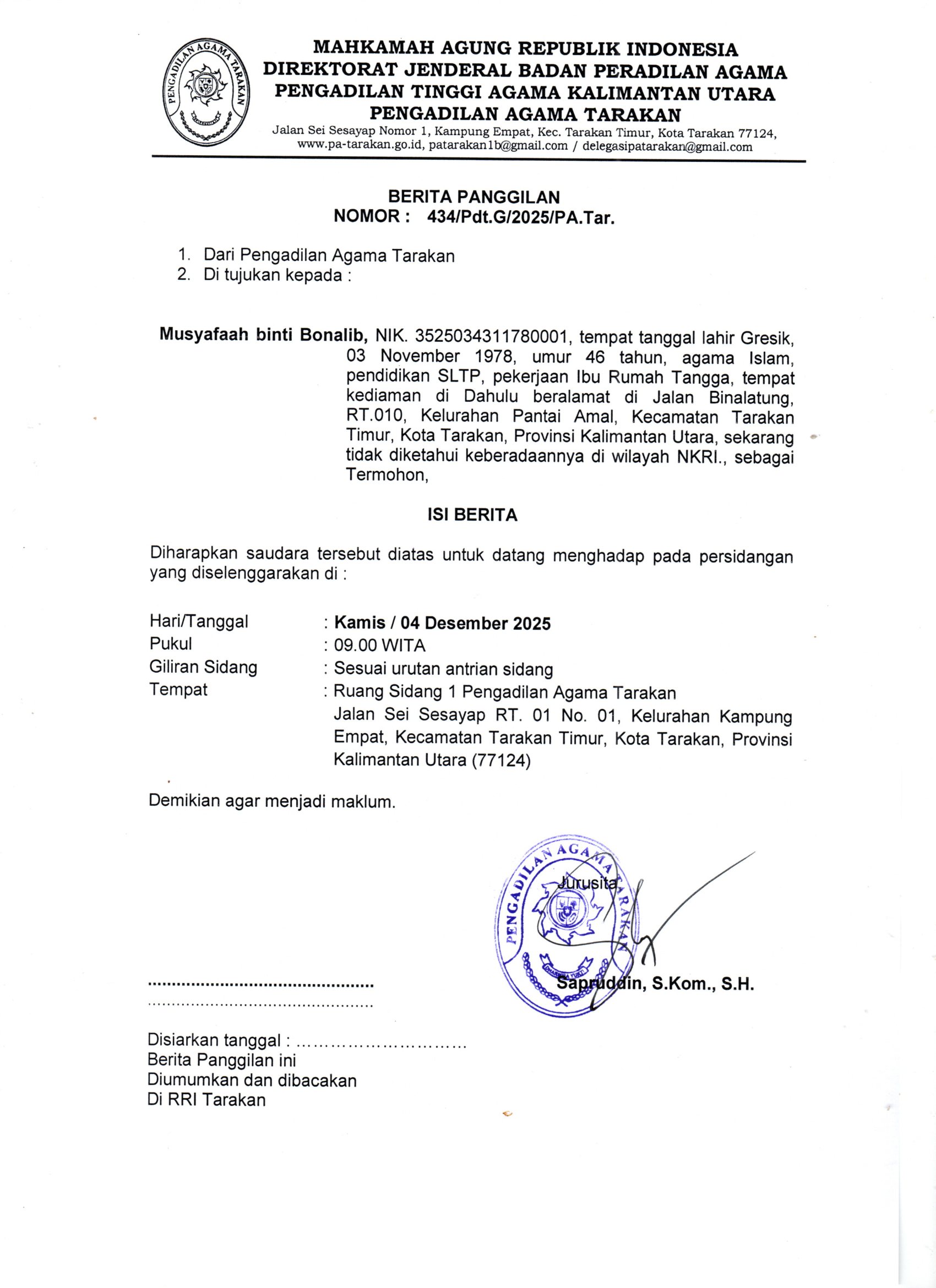 Next article: Pengumuman Perkara Nomor 432/Pdt.G/2025/PA.Tar