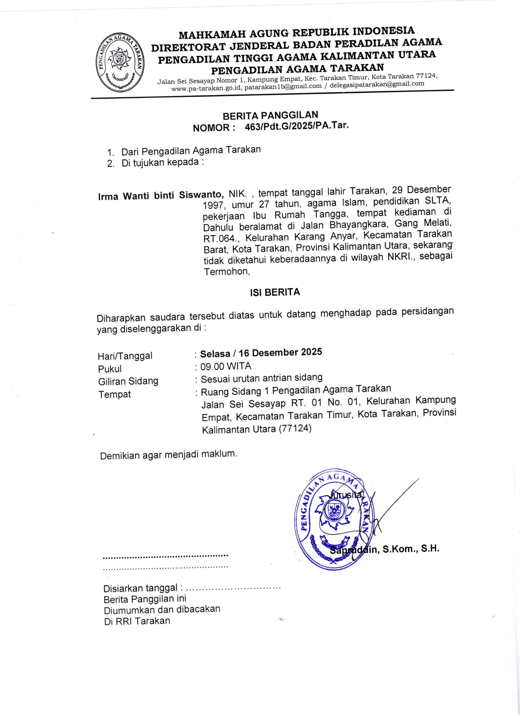 Next article: Pengumuman Perkara Nomor 465/Pdt.G/2025/PA.Tar