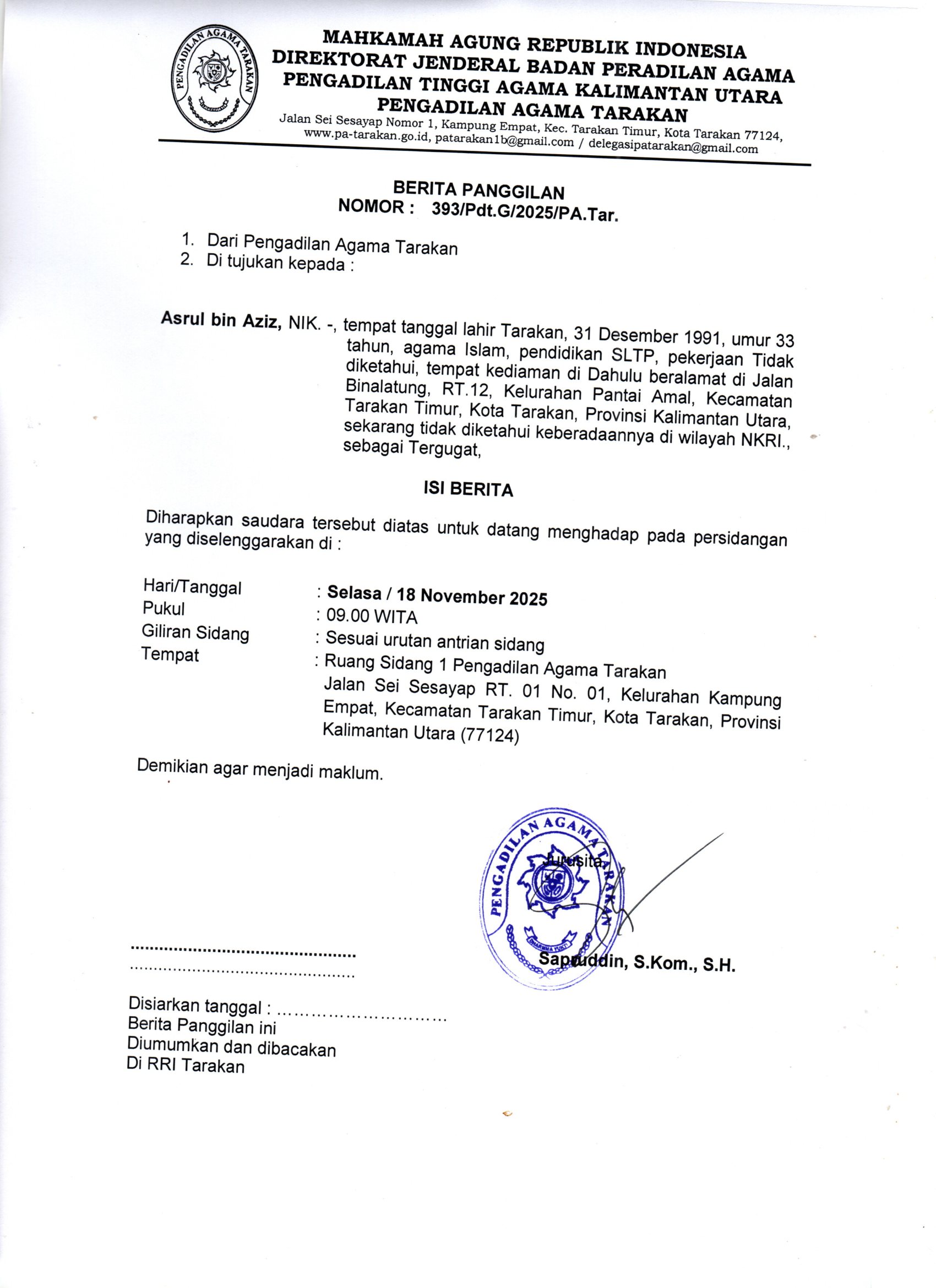 Panitera PA Tarakan Menghadiri Undangan Pelaksanaan Constatering dari Panitera PN Tarakan