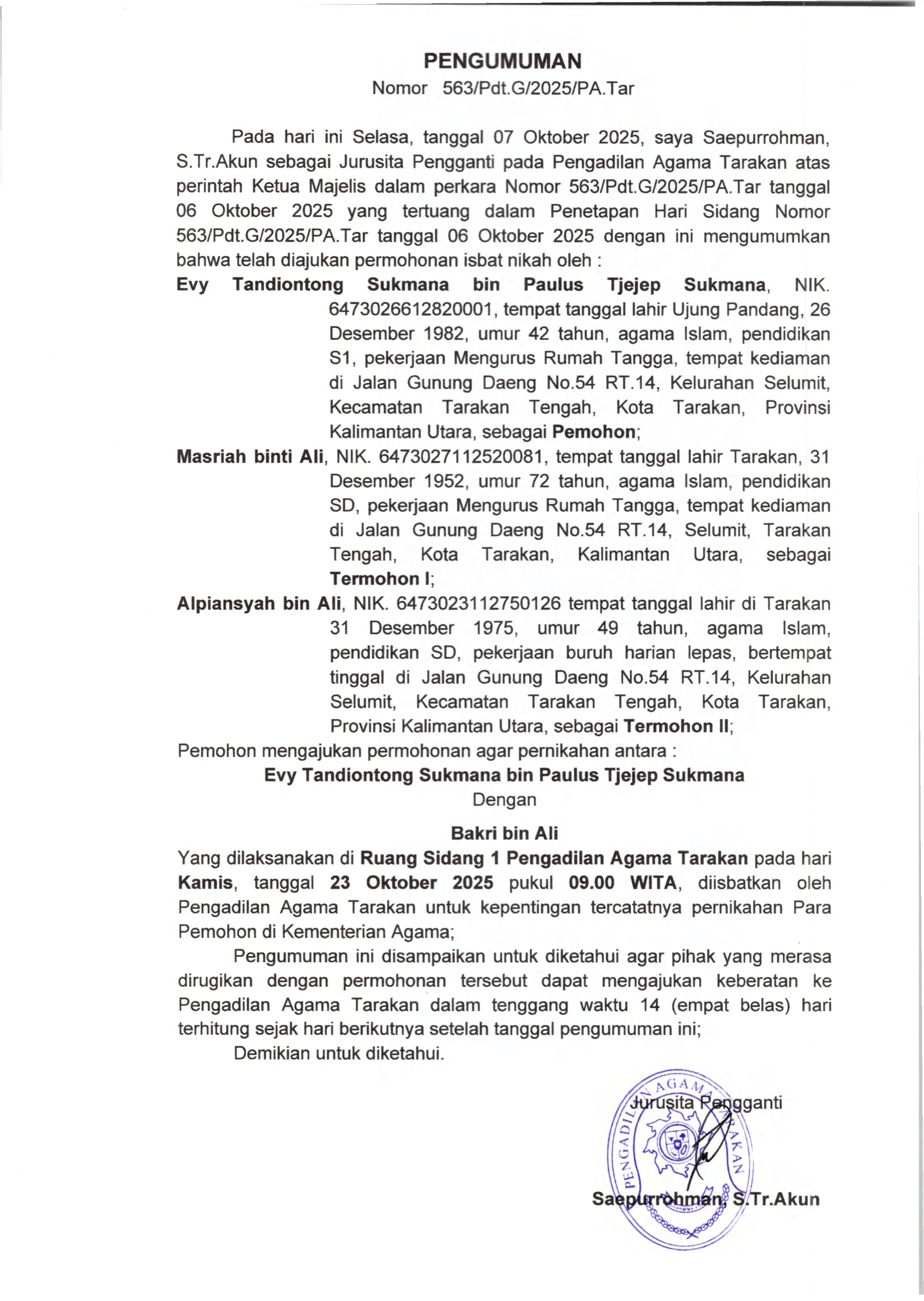 Pengumuman Perkara Nomor 563/Pdt.G/2025/PA.Tar